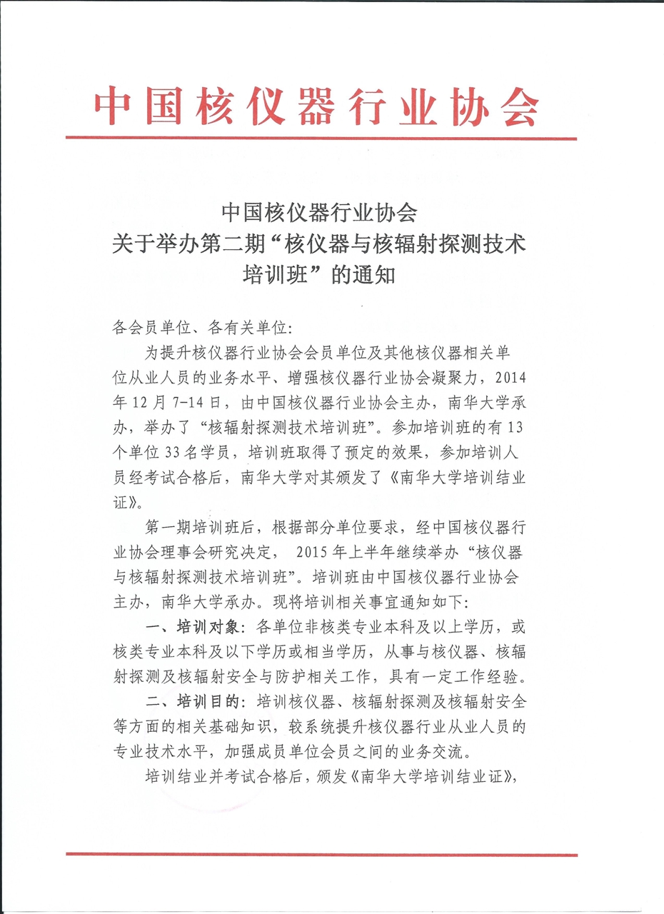 “核仪器与核辐射探测技术第二期培训班”圆满结束为提升核仪器行业协会会员单位及其他核仪器相关单位从业人员的业务水平、增强核仪器行业协会凝聚力,中国核仪器行业协会与南华大学于2015年6月23日至7月1日,举办了“核仪器与核辐射探测技术第二期培训班”,此次培训班是继2014年第一期培训班后举办的第二期培训班。参加培训的有各单位从事核探测相关工作,有一定工作经验的专业技术人员共计32人